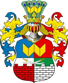 Герб потомства Яна Воеводского: в щите, имеющем красное поле, изображены два серебряных стропила, соединенные вместе наподобие буквы W. Щит увенчан дворянским шлемом и короной, на поверхности которой находятся два стропила. намёт на щите красный, подложенный серебром[4].