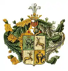 Щит разделён на четыре части, из коих в первой в зелёном поле два серебряных Змия один против другого поставленные, означены с правой стороны без крыл, а с левой с крыльями и над главами их видна дворянская Корона; в четвёртой части в золотом поле таким же образом изображены два Змия натурального цвета и Корона над ними; во второй и третьей части в серебряном поле два Оленя натурального цвета с золотою у одного из них находящегося в верхней части на шее Короною.