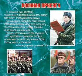 «Я, (фамилия, имя, отчество), поступаю на военную службу и присягаю на верность Российской Федерации и её народу. Клянусь соблюдать Конституцию и законы Российской Федерации, выполнять требования воинских уставов, приказы командиров и начальников, возложенные на меня законным образом обязанности.