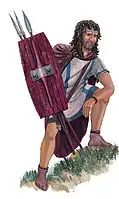 На вооружении иллирийцев было и множество других видов оружия, таких как метательные копья, длинные копья, называемые сибинами [76] (др.-греч. Σιβύνη) и напоминавшие кабанье копьё, [77] короткие копья для ближнего боя, боевые топоры (в том числе метательные), луки со стрелами (применяются с начала II тысячелетия до н. э.).
