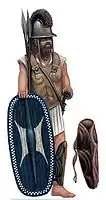 Иллирийцы начали пользоваться щитами еще в бронзовом веке. В железном веке использовались два типа щитов, а именно иллирийские круглые щиты и овальные/прямоугольные щиты, использовавшиеся в северной Иллирии. Наиболее распространёнными были круглые щиты, делавшиеся из обтянутого кожей дерева и снабжавшиеся бронзовыми бляхами; больше всего такие щиты напоминали лёгкую пельту.[71] Иллирийские круглые щиты напоминали македонские образцы, но отличались от многих других круглых щитов региона. Иллирийцы пользовались как круглыми (пельты), так и прямоугольными и овальными щитами.[72] Тип деревянных продолговатых щитов из дерева с железными бляхами появился в Иллирии благодаря кельтам.[73] Эти щиты напоминали североиллирийские овальные образцы.