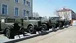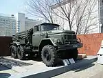 ![]() | Автомобили: ГАЗ-АА, ГАЗ-63, ЗИЛ-157, ГАЗ-66, Урал-4320, ЗИС-5 с пусковой установкой реактивной артиллерии БМ-13. Справа ЗИЛ-131 с 36-ствольной реактивной системой залпового огня «Град-1». | ![]() |
