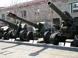 ![]() | Артиллерия представлена 203-мм гаубицей Б-4, 152-мм пушкой-гаубицей Д-20, 152-мм гаубицей-пушкой МЛ-20, 122-мм гаубицей М-30, 100-мм полевой пушкой БС-3, 85-мм дивизионной пушкой Д-44, 76-мм дивизионной пушкой ЗИС-3, 57-мм дивизионной пушкой ЗИС-2, 45-мм противотанковой пушкой М-42. | ![]() |