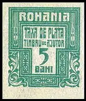 Военно-налоговые доплатные марки выпускались в Румынии в период 1915—1921 годов (включая период германской военной администрации в 1918 году)[1][2]. Они применялись дополнительно к военно-налоговым маркам, выходившим в этой стране в 1915—1918 годах. Надписи на таких марках гласят: рум. «TAXA DE PLATĂ» («Сбор к доплате») и «TIMBRU DE AJUTOR» («Налоговая марка»).