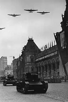 - состоялся парад 7 ноября. Прошли подразделения 1-й Московской мотострелковой дивизии (воины дивизии были вооружены автоматами ППД), эскадроны Особой кавбригады НКО, военные моряки, пограничники, войска НКВД, лётчики, воины частей ПВО, танкисты (средние танки Т-28, тяжёлые боевые машины Т-35, быстроходные танки БТ-7). Проехали бронеавтомобили БА-20 и БА-10.