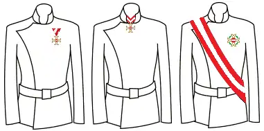Инсигнии Большого Креста включают знак ордена, нагрудную звезду и ленту-перевязь.