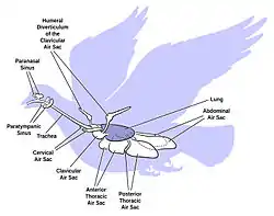 У птиц есть целая система воздушных мешков, изменяющих объём при вдохе и выдохе. Она служит для аэрации лёгких, отвода лишнего тепла и, возможно, изменения плотности тела при нырянии. Межключичный мешок участвует в издавании звуков. Шейные мешки у некоторых птиц могут раздуваться (например, у фрегатов — наподобие большого красного пузыря)[3][4]. Выросты воздушных мешков заходят в полости костей (пневматизация скелета). Судя по соответствующим отверстиям на костях, воздушные мешки были и у динозавров, в том числе крупных[5].