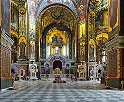Первоначально все купола собора были покрыты червонным золотом, а главный крест инкрустирован горным хрусталём. Работы по золочению куполов проводила фирма Семёна Абросимова из Санкт-Петербурга. Высота центрального купола с крестом достигает 74,7 м. На фасаде собора фирма «Альтшвагер» в 1902 году установила часы диаметром около 2 м. Часовой механизм был внутри собора.