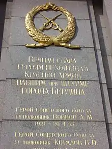 - Имеется следующая запись на пилоне Мемориала павшим советским воинам в Тиргартене: «Герой Советского Союза гв. полковник Войнов А. М., 1921‑20.04.45.»