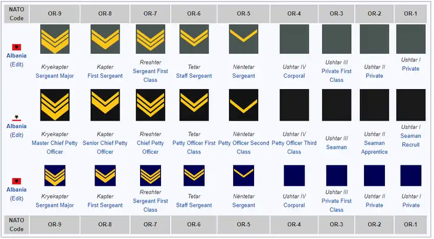 | Албанское звание | Kryekapter | Kapter | Rreshter | Tetar | Nëntetar | Ushtar IV | Ushtar III | Ushtar II | Ushtar I |