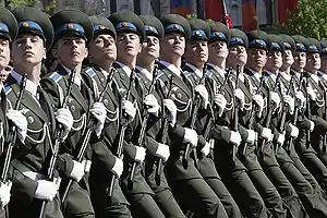 В Вооружённых силах России воинское приветствие выполняется сомкнутыми пальцами правой руки, выпрямленной кистью; в отличие от ряда других армий мира, при непокрытой голове[9] воинское приветствие выполняется без поднесения руки, принятием строевого положения.