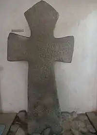 Надпись на кресте лапидарная. Сохранилась хорошо, но немного истёрта, в нескольких местах поцарапана. В верхней левой части креста поверхность камня приобрела белёсую окраску, не исключено, что к этому месту часто прикладывались богомольцы. Поле надписи длиной 77 см, высотой — 49 см. Надпись выполнена носителем новгородского диалекта[1].