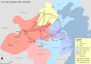 Будущий ханьский император Гао Цзу (Лю Бан) направился в свои владения в Сычуань, но октябре 206 года принял план, который ему предложил Хань Синь. Он неожиданно с войском направился назад и напал на Чжан Ханя — бывшего циньского генерала, получившего титул Юн-вана. Чжан Хань бежал в Фэйцю (сейчас Синпин, пров. Шэньси), и Лю Бан занял его владения и вошёл в Сяньян. Далее он продолжил наступление и окружил Чжан Ханя. Позднее, к концу 205 года, после годовой осады Лю Бан смог подвести воду и затопить город. Город сдался, а Чжан Хань покончил с собой.[4]