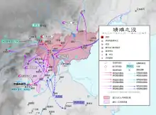 Ликвидировав ряд уделов и арестовав их властителей, летом 1399 года Двор направил в Бэйпин эмиссаров с тайным приказом об аресте Чжу Ди. Однако Чжу Ди узнал о приказе и стал действовать на опережение. Его войска захватили посланников и убили их. Чжу Ди обратился к своим войска с манифестом, в котором заявил, что основатель империи наделил всех своих сыновей уделами, которые должны дальше всегда передаваться по наследству и служить защитой страны. Таким образом, ликвидация уделов является нарушением воли покойного государя. На словах Чжу Ди во всём обвинил не самого императора, а его ближайших советников, однако при этом он приказал заменить девиз правления нового императора на девиз правления покойного основателя династии, что было равносильно непризнанию власти правящего властителя. Свои действия Чжу Ди назвал «борьбой ради преодоления трудностей», используя цитату из речи Чжу Юаньчжана 1370 года; тем самым он поставил своих противников на один уровень с властью иноземцев-монголов.