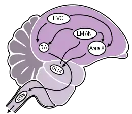 - Путь формирования пения: состоит из верхнего вокального центра (hіgh vocal center или hyperstrіatum ventralіs pars caudalіs, HVC), ядра аркопиллиума (rubust nucleus of arcopіllіum, RA) и части подъязычного ядра, которое идёт к трахее и сиринксу (tracheosyrіngeal nerve)[60][61];