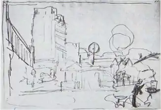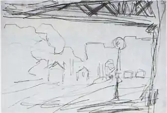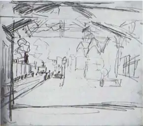 D151. Эскиз для W443: вид за мостом Европы, на заднем плане два входа в туннель Батиньоль, над которым возвышаются здания
