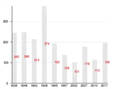 | 1838 | 1848 | 1862 | 1928 | 1965 | 1997 | 2007[32] |