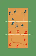 - 6-2 — четыре нападающих и два связующих, передачу отдаёт тот из них, кто выходит с задней линии, в то время как связующий на передней линии играет в атаке.