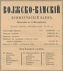 Правление располагалось в Санкт-Петербурге, с 1881 года — в доме № 38 по Невскому проспекту. Отделение банка в Москве размещалось на Ильинке (ныне д. 8, стр. 2). Оперируя главным образом привлеченными ресурсами, банк создал сеть отделений (к 1914 году — 60), охватившую коммерческие центры Поволжья и Предуралья — в Самаре (ул. Куйбышева, 92), Нижнем Новгороде (Рождественская ул., 27), Рыбинске (Волжская набережная, 47-49), Симбирске, Перми (Петропавловская ул., 25а; затем — Покровская ул., 32); а также в Киеве, Харькове, Воронеже (ул. Плехановская, 10), Ростове-на-Дону (ул. Б. Садовая, дом № 55), Екатеринбурге, Ташкенте, Иркутске, Баку (Горчаковская ул., 6[2]) и др.