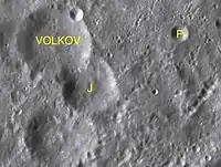 ![]() Снимок зонда Lunar Reconnaissance Orbiter. Сверху вниз кратер Волков, сателлитный кратер Волков J, кратер Ландер. | |