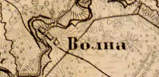 ВОЛНА — деревня владельческая при реке Вруде, по 2-й Самерской дороге по правую сторону в 51 версте от Ямбурга, число дворов — 37, число жителей: 102 м. п., 135 ж. п. (1862 год)[11]
