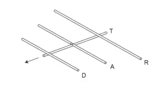 Антенна состоит из расположенных на траве́рсе (на рисунке — Т) активного (A) и ряда пассивных вибраторов — рефлекторов (R), расположенных относительно направления излучения за активным вибратором, а также директоров (D), расположенных перед активным вибратором. Чаще всего применяется один рефлектор, число директоров меняется от нуля до десятков. Активный вибратор имеет длину около полуволны (0,5 λ), рефлектор — длину, немного большую 0,5 λ, а директоры имеют длину, меньшую 0,5 λ. Расстояния от активного вибратора до рефлектора и до первого директора составляют около 0,25 λ.
