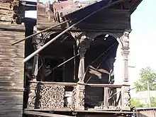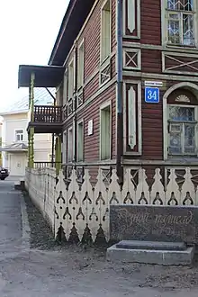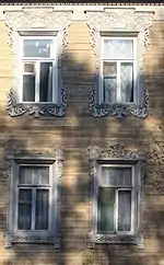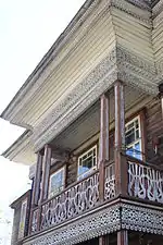| Наличники разных типов дома на Зосимовской улице, 21 | Резной пилон дома на улице Лермонтова, 29 | Пропильная резьба в декоре балкона и карниза. Дом Воробьёва (улица Засодимского, 14) |