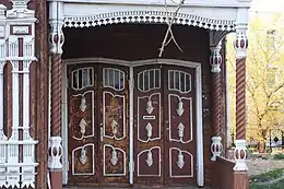 В декоре дома могли использоваться как традиционные наличники, так и сложные украшения в стиле модерн. Модерн в декоре домов выражался в убранстве балконов ниспадающими складками, подзорами в виде свисающих кистей, выпиленных лилий, животных, цветов[12]. Углы фасада декорировали плоскими резными узорами, чаще заключёнными в рамку. Украшения элементов дома не были избыточными: