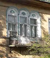 | Веерообразные розетки в нишах окна. Улица Гоголя, 96 | Мезонин с декором в стиле модерн. Улица Чернышевского, 15 | Входные двери и крыльцо с декором в стиле модерн. Дом Бутыриной (Благовещенская улица, 22) |