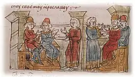 ![]() Отправление участниками Уветичского съезда посольства к Володарю и Васильку, отказ Володаря и Василька от предложения | |