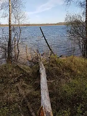 Котловина озера эворзионного типа, слегка вытянутая с севера на юг. Склоны высотой 5—8 м, пологие. Восточные склоны суглинистые, крутые, распаханные. Северные и западные склоны сложены камовыми и озовыми песками и покрыты хвойным лесом[1][6][7]. Коэффициент изрезанности береговой линии составляет 1,78[5]. Берега низкие, поросшие кустарником и редколесьем, местами заболоченные. Северо-восточные и восточные берега возвышенные (до 0,5 м), песчаные[3].