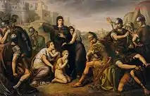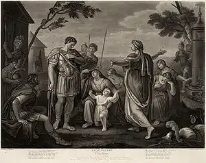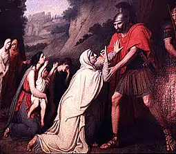 Тогда Волумния, а также мать Кориолана Ветурия, взяв двоих его маленьких сыновей, вышли из города ему навстречу с просьбой пощадить город. Решимость Кориолана была сломлена, и он отступил от города[4], за что был убит недовольными вольсками[6].