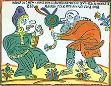 Волынка (дуда, коза) состоит из кожаного воздушного резервуара — меха с двумя или тремя игровыми трубками, а также трубки для нагнетания воздуха[19]. Родиной русской волынки считается Волынь — область Западной Руси[20]. В Белоруссии и на Украине она называется дуда, в Польше[21] и Молдавии[20] — коза. Была некогда популярным на Руси народным музыкальным инструментом[22]. Сведения о ней встречаются в иконографических и письменных памятниках культуры русского народа XVI—XIX веков. Самое раннее изображение имеется в Радзивиловской летописи (XV век) на миниатюре «Игрище славян вятичей»[23]. В 2015 году при раскопках на Пятницком раскопе в Старой Руссе была найдена деталь волынки — чантр (мелодическая трубка). Находка датируется концом XIV века и является древнейшей и единственной на территории русских княжеств[24][25][26].