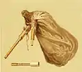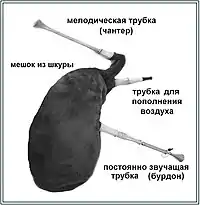 Изготавливалась из бычьего пузыря[29] или цельного кожаного мешка, снятого с козлёнка, двух тростниковых трубок, настроенных в квинту — мелодической (жалейка[27]) и бурдонирующей (издающей неизменный тон), а также трубки для нагнетания воздуха[30].