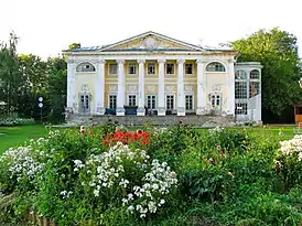 Главный дом с 6-колонным ионическим портиком, стоящий с недавнего времени почти на самом берегу водохранилища, имеет два этажа, из которых нижний считался парадным, а верхний — жилым. Планировка обоих этажей анфиладная. Главный фасад оформлен ризалитом (лоджией) с лепными гирляндами и барельефными профилями древних греков на овальных дисках. Интерьеры сохранились плохо: в парадном зале — карниз с «сухариками», на откосах — дубовые панели резной работы. Фундаменты дворца страдают от влажности и регулярного подтопления водохранилищем[3].
