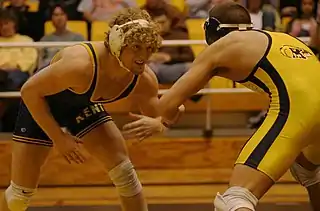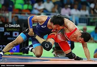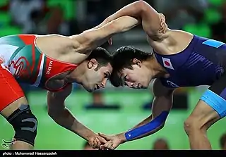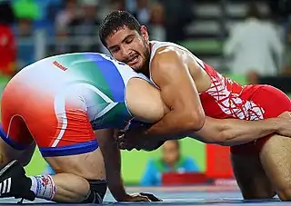 ![]() Вольная борьба характеризуется обилием действий в партере и захватов за ноги | |