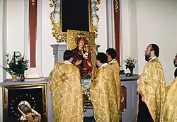 Священнослужители вкладывают Теребовлянскую икону в раму в Архикафедральном соборе св. Юра во Львове