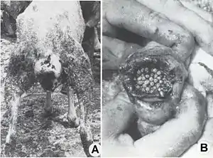 В процессе развития, личинки мигрируют, разрушая ткани с помощью пищеварительных ферментов и ротовых крючьев. Личинки выедают живые ткани, разрушают кровеносные сосуды. Ткани воспаляются; в них появляются нагноения, развивается гангрена.