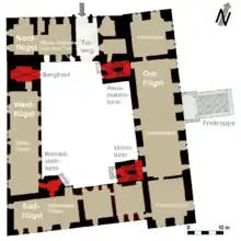 Северное и южное крыло построены в XVI веке и в основном использовались как жилые. Восточное крыло достигает высоты около 25 метров и было построено в начале XVII века. После его возведения, благодаря великолепными декоративными архитектурными формами эпохи Везерского Ренессанса комплекс внешне превратился из крепости в дворцово-замковый комплекс. На первом этаже восточного крыла находится просторный рыцарский зал длиной 30 и шириной 9 метров. К нему примыкают Малый зал, Каминный зал и кабинет. Сохранились остатки аркадного крыльца, выходящего из восточного крыла во внутренний закрытый двор (размером 50×60 метров).