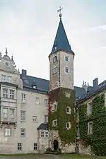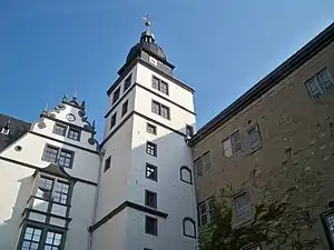 Бергфрид (главная башня) встроен в здание как часть западного крыла. Башня построена на квадратном фундаменте со сторонами 9×9 метров. Высота башни составляет около 23 метров, а толщину её стен достигает 3 метров. Бергфрид является самой старой частью всего комплекса. Начало её строительства, вероятно, относится к XIII веку.
