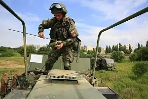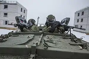 - Мотострелковые войска[~ 1], МСВ — самый многочисленный род сухопутных войск, представляет собой моторизованную пехоту, оснащённую БМП и БТР, грузовыми автомобилями КрАЗ 255 Б, КрАЗ 6322, КАМАЗ 5320, КАМАЗ 4310, КАМАЗ 53201. Состоят из мотострелковых соединений, частей и подразделений, в которые входят мотострелковые, артиллерийские, танковые и другие части и подразделения.