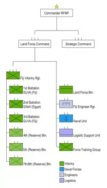 - Командующий Вооружёнными силами Республики Фиджи (RFMF) (англ. Commander RFMF) имеет двухзвездный ранг. Ему помогают заместитель командующего и начальник штаба, которые отвечают за стратегическое командование и сухопутные войска. Действующий командующий — контр-адмирал Вилиам Наупото, был назначен после отставки бригадира Мозиса Тикоитоги 2 августа 2015 года. После тридцати девяти лет безупречной военной службы[3] Тикоитога достиг успеха в качестве командира при нынешнем главе правительства, Фрэнке Мбаинимараме.