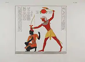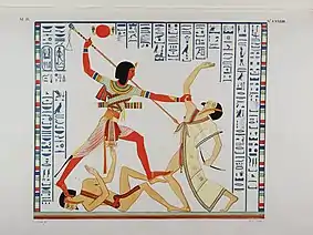 | Слева египтянин сражается с ливийсками войнами, а справа пленит нубийца. Обе фрески чётко демонстрируют, что египтяне изображали себя темнее европеоидов, но и негроиды были с их точки зрения темнее и с явными отличиями в строении лица | |