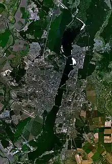 Воро́нежское водохрани́лище — водохранилище на реке Воронеж на территории Воронежской области России. Целиком расположено в городском округе Воронеж и является одним из крупнейших в мире водохранилищ, целиком расположенных в городской черте[1]. Исходные (проектные) параметры водохранилища были таковы: площадь 70 км²[2], объём 0,204 км³, длина 35 км, средняя ширина 2 км, средняя глубина 2,9 м, высота над уровнем моря — 93,0 м. В настоящее время водохранилище изменило свои размеры: площадь 59,9 км², объём 0,1993 км³, средняя ширина 1,7 км, средняя глубина 3,3 м, максимальная глубина 19,4 м[3]. Образовано в 1971—1972 годах плотиной[4]. Образовано в целях промышленного водоснабжения города. В разговорной речи воронежцев иногда называется морем или Воронежским морем[5][6]. В настоящее время сильно загрязнено[1]. Ведутся работы по увеличению средней глубины водоёма с целью его очистки[7]. На берегах водохранилища расположен город Воронеж.