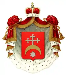 Описание герба: Выдержка из Общего гербовника В червленом поле на золотом опрокинутом полумесяце серебряный крест, сопровождаемый внизу серебряною же о шести лучах звездою. Щит увенчан серебряным с золотыми украшениями коронованным шлемом. Нашлемник: серебряная о шести лучах звезда. Наметы: справа червленый с золотом, а слева червленый с серебром. Герб украшен червленой, подбитой горностаем мантией с золотыми кистями и бахромой, и увенчан княжеской короной. |