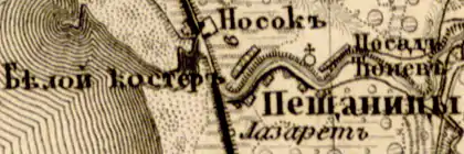 На карте Санкт-Петербургской губернии Ф. Ф. Шуберта 1834 года упоминаются смежные: деревня Белой-Костёр, деревня Тюнев-Посад и деревня Пещаницы, состоящая из 33 крестьянских дворов, а к югу от них Лазарет Канавных Служителей[2].