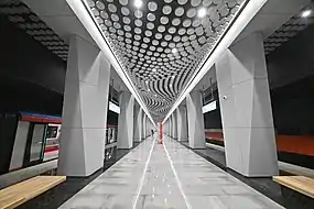 - 20 июля 2021 года — завершается монтаж подвесного потолка, ведутся работы по отделке пассажирских зон, служебных и технических помещений.[14]