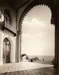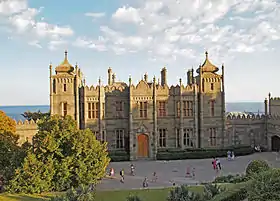 Однако, согласно идеологии и эстетике периода историзма, «стиль Тюдоров» смешался с иными источниками, которые диктовала сама местность. Поэтому в законченном облике дворца сказались веяния неомавританского стиля, обусловленного историей Крыма. Так «готические» дымовые трубы напоминают миниатюрные исламские минареты. Благодаря необычному силуэту с «мавританскими» куполами, более похожими на индийские, и башнями дворец органично вписался в окружающий горный ландшафт[4].