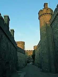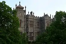 Главный портал согласно пожеланию заказчика оформлен «в мавританском вкусе». Большая ниша, подобная михрабу мечети или среднеазиатскому пештаку, оформлена подковообразной аркой, наверху — балюстрада из полуготических-полумавританских арочек и башенки-минареты. В орнаментальной резьбе по ганчу в нише переплетаются рисунок тюдоровского цветка и мотив лотоса. Фриз украшает шестикратно повторенная арабская надпись: «И нет победителя кроме Аллаха», заимствованная из дворца в Альгамбре[5].