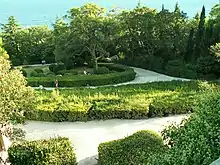 Алупкинский парк поднимается уступами от моря на высоту до полукилометра. Он делится на две части. Регулярный сад расположен на ближайшем к дворцу участке и южных террасах. Отдалённые земли усадьбы занимал пейзажный парк английского стиля, шедевр садово-паркового искусства. Его создатель — немецкий ботаник и садовник Карл Антонович Кебах. Площадь парка около 40 га. Помимо английского, был создан уникальный сад камней, или «алупкинский хаос» («большой» и «малый»), в котором использованы природные нагромождения глыб диабаза. «Дикие» россыпи камней нижнего парка с «живописными группами сосен, дорожки, затейливо петляющие среди глыб базальта, пещеры, гроты и ручейки, экзотические растения — всё создаёт ощущение таинственности»[10].